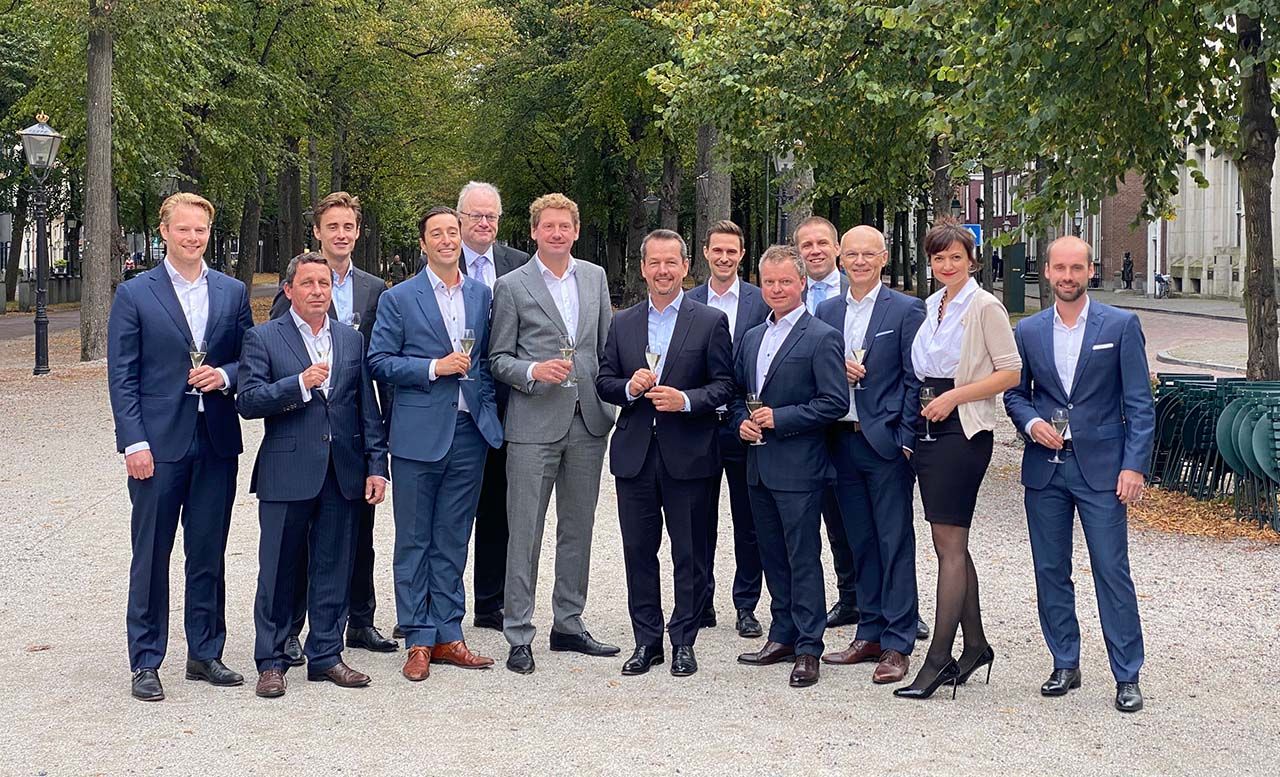 Representatives from Egeria, SWARCO and Dynniq Mobility sealing the transaction with a glass of Champagne on 30 September 2021 in The Hague